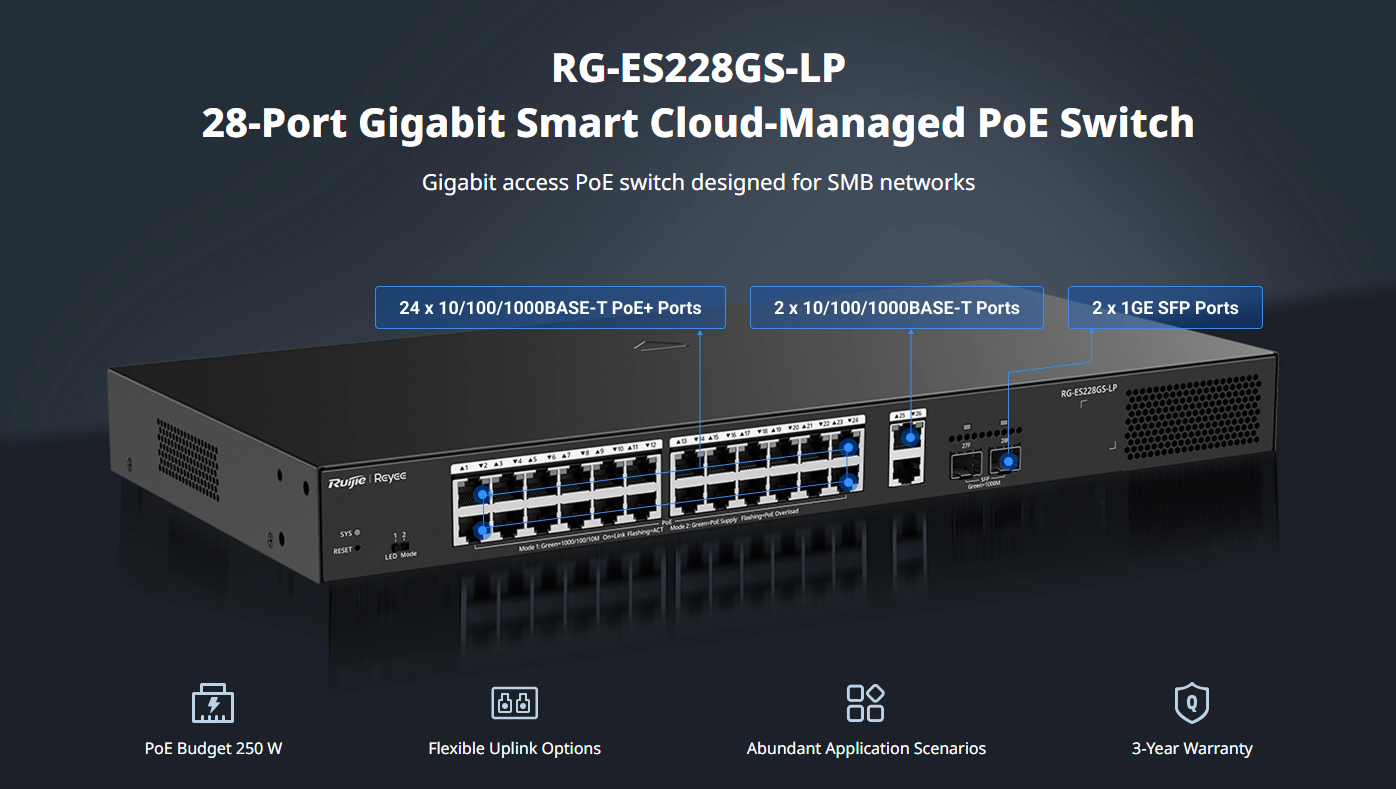 RG-ES228GS-LP, 28-Port Gigabit Smart Cloud Managed PoE Switch