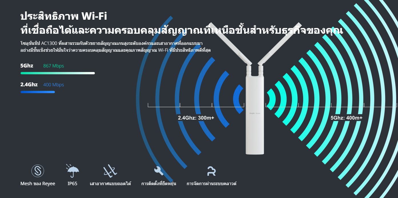RG-RAP52-OD อุปกรณ์กระจายสัญญาณสำหรับภายนอกอาคารแบบสองย่านความถี่ที่รองรับ Wi-Fi 5 มาตรฐาน AC1300 ของ Reyee