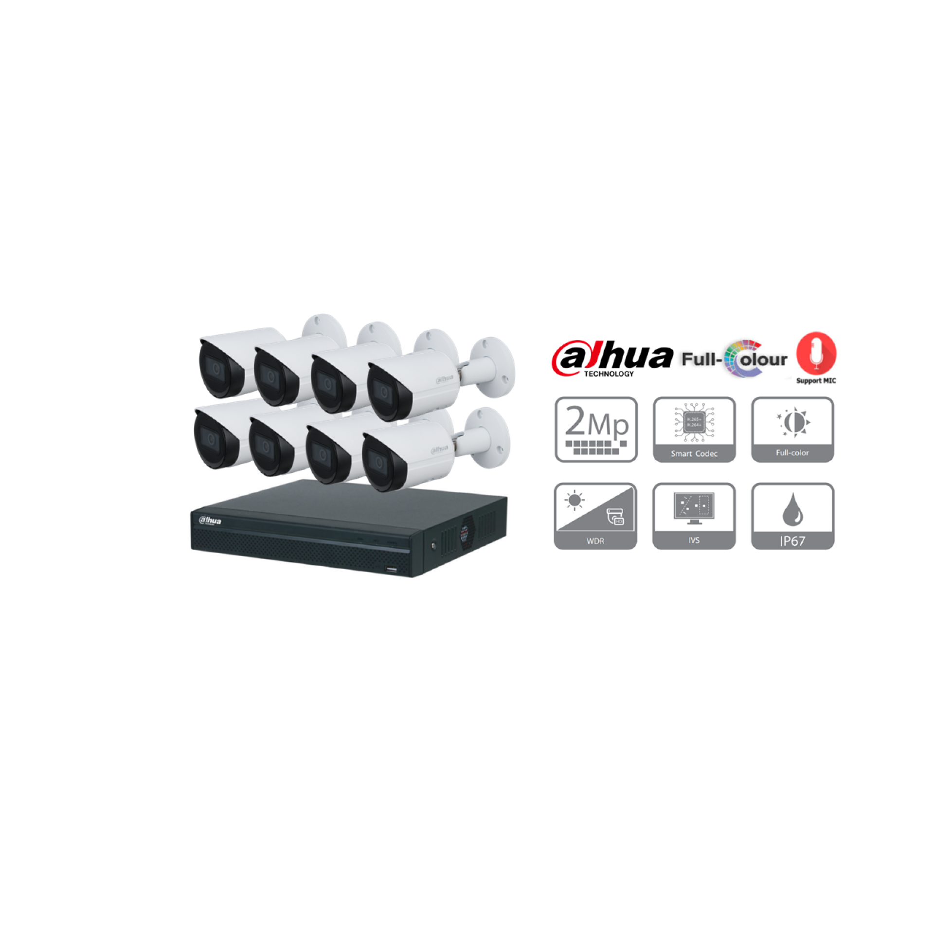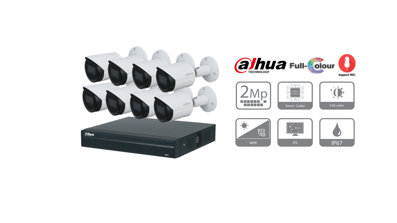 DAHUA ชุดกล้องวงจรปิด IP Camera (PoE) 2 ล้านพิกเซล 8 ตัว (FULL COLOR ย้อนแสงได้ มีไมค์ในตัวบันทึกเสียงได้)